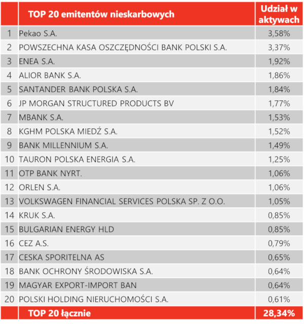 W praktyce, obok obligacji skarbowych inwestujemy więc przede wszystkim w obligacje takich podmiotów, jak Bank PKO BP, Pekao SA, PZU, Tauron Polska Energia, KGHM. Zestawienie największych nieskarbowych obligacji w portfelu Investor Oszczędnościowy publikujemy poniżej.
