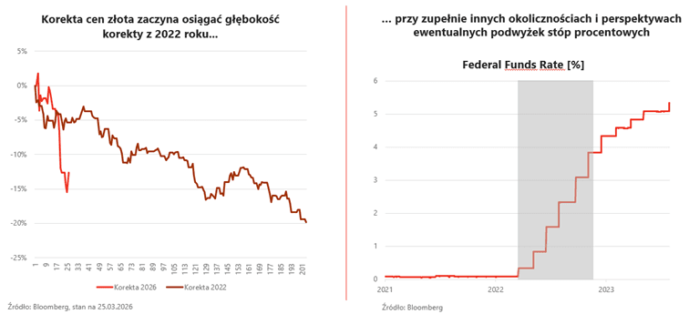 - Obecna korekta jest porównywalna do tej z 2022 roku, choć ówczesne uwarunkowania były istotnie inne. Wówczas banki centralne rozpoczynały cykl podwyżek z poziomu bliskiego zeru, po okresie silnej ekspansji monetarnej. Dziś presja inflacyjna ma bardziej złożony charakter, a mechanizm jej przenoszenia jest słabszy. Nie można wykluczyć różnych scenariuszy, jednak obecna wycena złota odzwierciedla wariant wyraźnie pesymistyczny. Wraz z upływem czasu oczekujemy jego korekty, co powinno sprzyjać zakończeniu spadków cen kruszcu.
